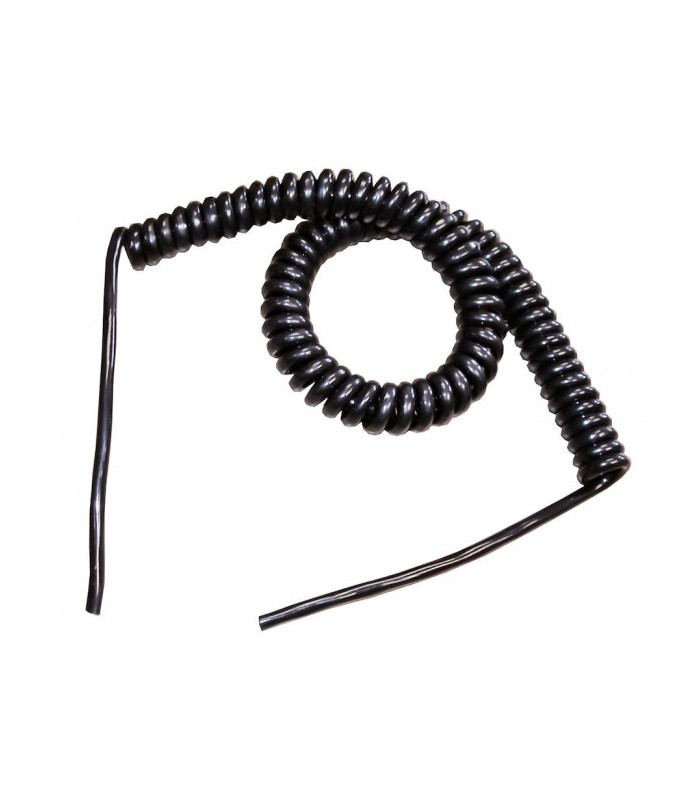 Spiralkabel 4-ledare med kabealarea 4x0,75 mm². Effektiv arbetslängd 3 meter. DIameter spiral 24 mm. Diameter kabel 6,5 mm. Färg på innerledare: blå, gul, brun och svart. Ytterhölje i svart TPU (Termoplastisk Polyuretan).