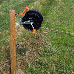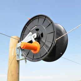 En stark och hållbar spole med spärrmekanism för att linda upp och dra ut vidoflextråd. Lämplig för upp till 500m vidoflextråd. Utrustad med isolerat handtag. Hakas direkt på stängslet eller används med stativ. (Lös spole 8030)