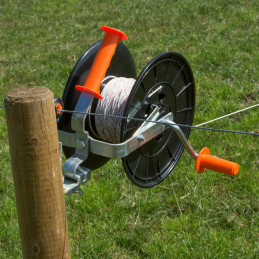 Försedd med en robust utväxling för att enkelt och snabbt kunna rulla upp tråden (2,7:1). Inklusive hållare för Gallagher Insul-handtag (medföljer). Lämplig för: 400 m 12,5 mm TurboLine-band, 400 m 12,5 mm PowerLine-band, 1000 m Vidoflex 9 eller 1200 m Vidoflex 6.