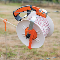 En stark och hållbar spole med spärrmekanism för att linda upp och dra ut vidoflextråd. Lämplig för upp till 500m vidoflextråd. Utrustad med isolerat handtag. Hakas direkt på stängslet eller används med stativ. (Lös spole 8030)