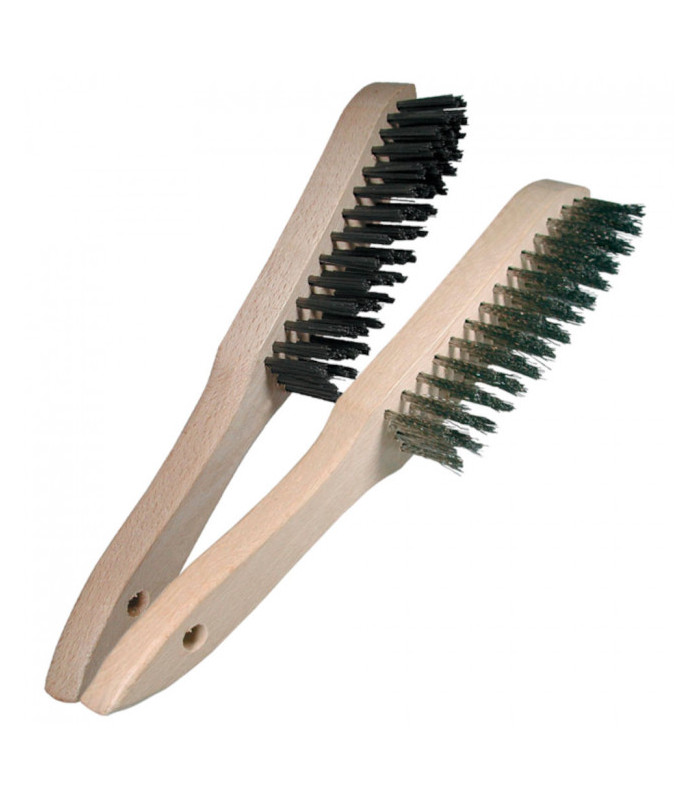 Handtag gjort av bokträ med runda kanter och 10 mm hål för upphängning. För rostborttagning och rengöring. Borstar med rostfritt stål är icke-magnetiska.