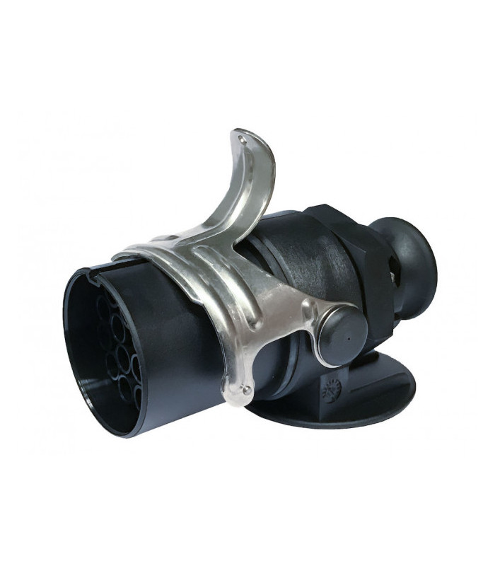 15-polig med trumpetanslutning. DIN/ISO 12098. 15 hylsor, 12 st 1,5 mm² och 3 st 2,5 mm². Levereras med stift för pressning/lödning alternativ skruvanslutning. ADR-godkänd. Levereras med påse och ryttare för butik.