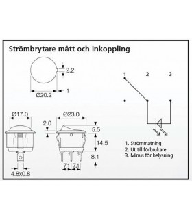 Belyst strömbrytare för extraförbrukare. Varningsljussymbol on/off. Max 6 A vid kontinuerlig belastning. Håldiameter 20,2 mm. Försilvrade kontakter. Hus i nylon 66. Livslängd 10 000 operationer vid 6 A belastning. Tål ej utomhusbruk.
