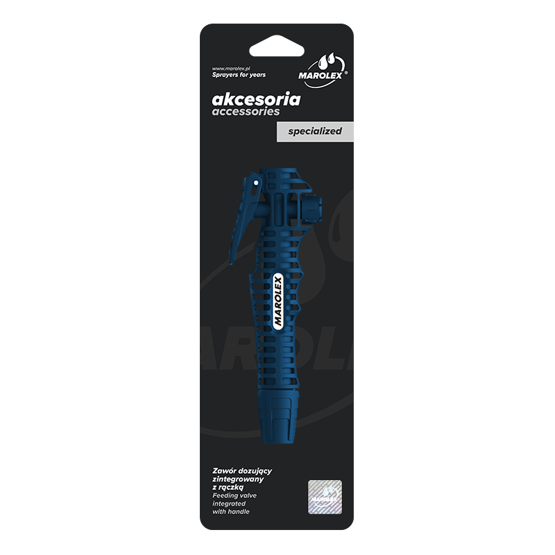 Handtaget har profilerats på det sätt som bäst passar handens anatomiska form. Det ger ett säkert grepp och exakt dispensering av preparatet, både för högerhänta och vänsterhänta. Doseringsventilen har en automatisk låsning i påslaget läge, så att du inte behöver hålla knappen intryckt kontinuerligt under långvarig sprutning. Doseringsventilkolven har försetts med en dubbel tätning, som fungerar som en automatisk smörjanordning, vilket förlänger ventilen problemfri drifttid. Tätningar som används i handtaget är resistenta mot alkaliska ämnen. Den fullständiga listan över medel finns i resistenstabellen.