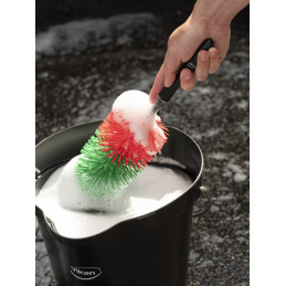 Stor och lång fälgborste som har möjligheten att rengöra hela fälgen. Med det skyddande höljet på skaftet, i änden samt de mjuka borststråna bidrar de alla till att skydda fälgen. Rörformen når in i hjulets fördjupningar och trånga håligheter. Typ av borste: Mjuk Mått: 425 x Ø 105 mm Fiber: 50 mm Material: PP/PBT Antal per kartong: 5 st Temperatur: Max 100 grader C.