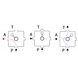 | Ventil typ | 3-vägs, 3-pos. Stängt centrum blockerat |
