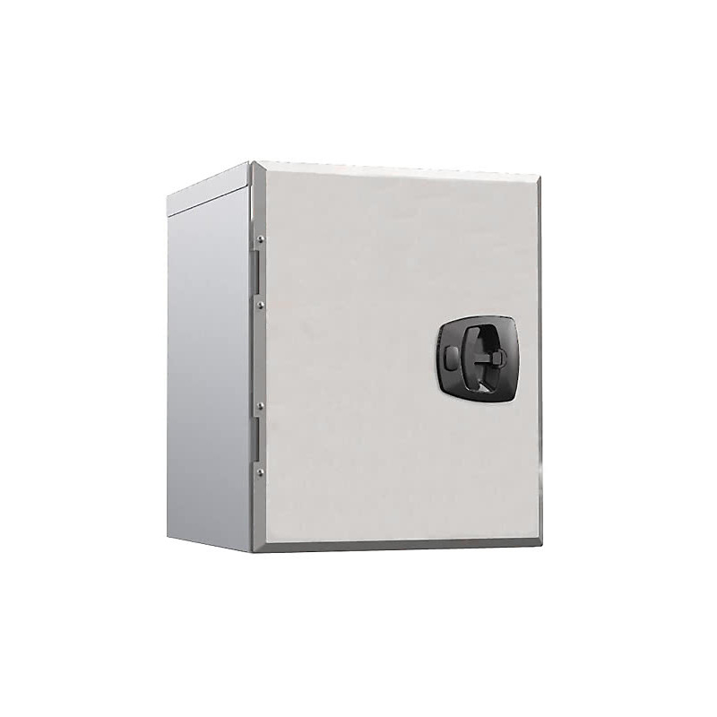 Verktygslådan är tillverkad i anodiserad aluminiumplåt, dörren och gångjärnen är tillverkade i polerat rostfritt stål. Låsbart lås i hårdplast.