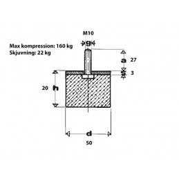 Vibrationsdämpare i gummikvalitet NK 55 SHORE +/-5° och gulkromaterade metalldelar enligt ST37. L1 på ritning = gänglängd.