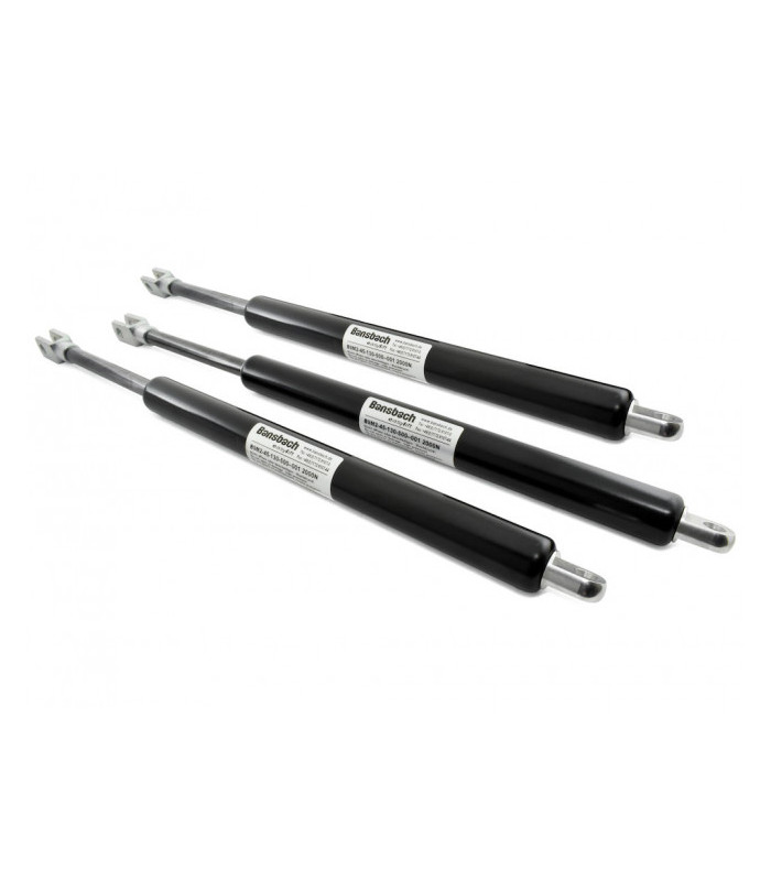 Gasfjäder med gaffelfäste (art.nr 0393) i kolvstångsdelen, samt fast ögla 8,2 mm hål. Bansbachfjädrarna har en svart, keramisk ytbehandling på kolvstängerna.
