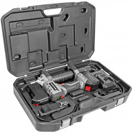 Kraftfull & robust, tekniskt avancerad batteridriven fettspruta med 2 st flödeshastigheter. Utrustad med LCD-display som visar fettnivå i gram eller uns, samt batteriladdning och fyllnadsgrad i tuben. Levereras med 1 st 2Ah 20V Litium-batteri & batteriladdare (230v) i en stadig väska. 1 batteri räcker till 24st tuber. Sprutan är även utrustad med LED-ljus, för att lokalisera smörjnipplar i svagt ljus.