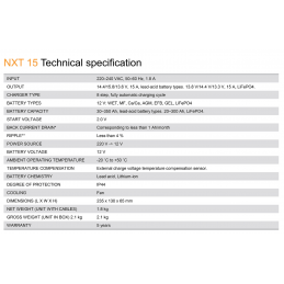 När tiden är dyrbar och kapaciteten krävs, levererar NXT 15. Med en laddstyrka på 15 Ampere är detta laddaren för dig som snabbt behöver få fart på större batterisystem i husbilen, båten eller på verkstaden. NXT 15 kombinerar råstyrka med intelligent mikroprossesteknik som inte bara laddar snabbt, utan också vårdar batteriet för maximal hållbarhet. En tungviktare i kompakt format.