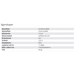 -Automatisk oljevakt som bryter vid för låg oljenivå -Uttag 1x400V 32A CEE, 1x230V 32A CEE, 1x230V 16A Schuko -ELCB-GFI (Jordfelsbrytare) -Strömbrytare -Skyddsram -Uppfyller EG-direktiv