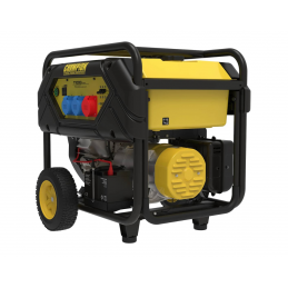 Champion 500111-S3 drivs på bensin och har en generös bränsletank på 42 liter, vilket ger mer än 9 timmars driftstid. Elverket är utrustat med 2 x 230V 32A och 1 x 400V 32A uttag, alla med automatsäkringar och IP44-klassning.