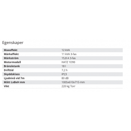 1Portabelt elverk med en Kohler dieselmotor -Magnapull med automatisk dekompression -Uttag 1x 230V 16A 2P+T CEE - 1x 230V 16A 2P+T Schuko -Överbelastning termisk avstängning -Batteriladdare med automatsäkring -Skyddsram -Bärbar -Uppfyller EG-direkti