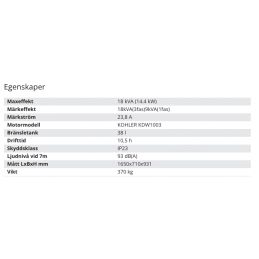 1Portabelt elverk med en Kohler dieselmotor -Magnapull med automatisk dekompression -Uttag 1x 230V 16A 2P+T CEE - 1x 230V 16A 2P+T Schuko -Överbelastning termisk avstängning -Batteriladdare med automatsäkring -Skyddsram -Bärbar -Uppfyller EG-direkti