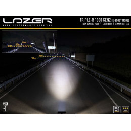 Triple-R 1000 med blixtljus och positionsljus mäter 410 mm i bredd, 73 mm i höjd och 105 mm i djup. Denna modell erbjuder integrerat R65-godkänt varningsljus och positionsljus i vitt eller orange. Finns med svart eller vitt lamphus. Den är försedd med en E-boost-funktion där du får ett riktigt pangljus på hela 9240 lumen med funktionen aktiverad. När du ska köra på allmänna vägar ändrar du med en enkel manöver till det E-godkända läget som även det ger en imponerande ljusstyrka.