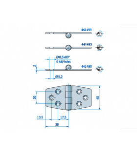 Gångjärn i rostfritt utförande. Totallängd 38 mm, 19+19 mm. Höjd leddel 40 mm. Godstjocklek 2 mm.