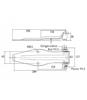 Gångjärn i rostfritt utförande. Totallängd 266 mm, 230,5 + 35,5 mm. Höjd leddel 147 mm. Godstjocklek 4 mm.