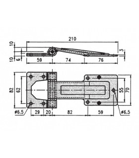 Gångjärn i rostfritt utförande. Totallängd 187 mm, 72+115 mm. Höjd leddel 65 mm. Godstjocklek 4 mm.
