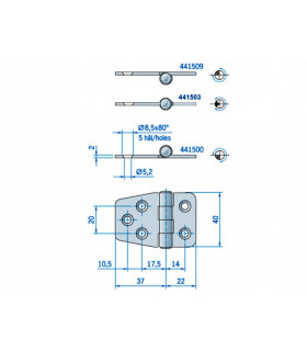Gångjärn i rostfritt utförande. Totallängd 38 mm, 19+19 mm. Höjd leddel 40 mm. Godstjocklek 2 mm.