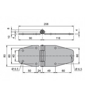 Gångjärn i rostfritt utförande. Finns med 2 olika storlekar på fästhål 6,5 mm samt 8,5 mm. Totallängd 210 mm, 60+150 mm. Höjd leddel 82 mm. Godstjocklek 3 mm.