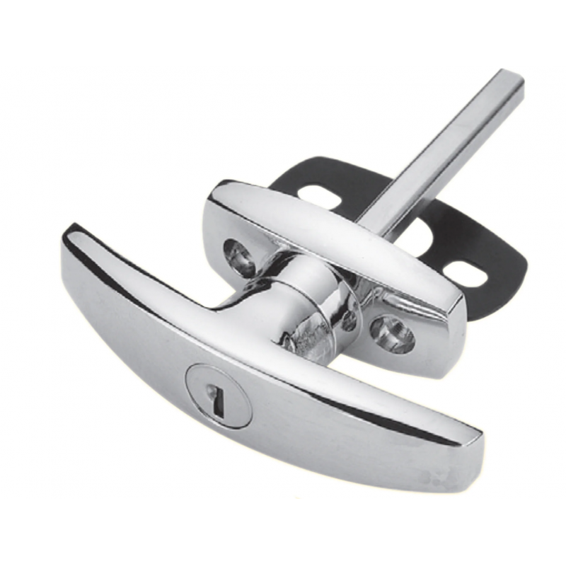 Förkromat T-handtag med nyckellåsning. Finns med eller utan gängad 4-kantstapp samt som sats om 3 handtag. Nyckel ingår.