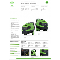 Den nya PW-H61 är den trefasiga varmvatten-högtryckstvättaren idealisk för alla arbetsförhållanden . Tillhör det nya sortimentet av högtryckstvättar för varmvatten , har den försetts med en ny design för kåpa, hjul och kontrollpanel, och användarvänlig tillgång till justeringar och påfyllning av vätskor. Value-versionerna är utrustade med signallampor...