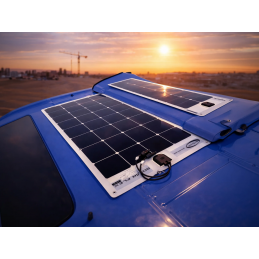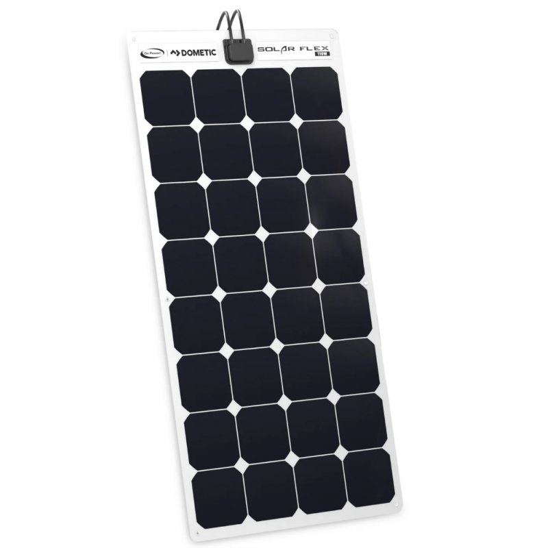 Den här flexibla 110 Wp solpanelen producerar mer kraft per kvadratmeter än någon annan platt solpanel på marknaden. Tack vare sin låga vikt och ultratunna yta på endast 3 mm kan den böjas upp till 30° och konturerar därmed snyggt till lastbilshytter, trailerkarosser eller välvda skåpbilstak. Panelen är självhäftande för att underlätta installationen. Se även dokument nedan och videon på en exempelinstallation.