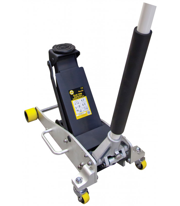 Robust laserskuren domkraft med låg profil. • Nylon hjul • Sadelskydd gummi • Dubbelpump • Låg modell • Rakt handtag • Utrustad med tillbehörsfack.