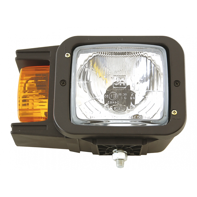 Strålkastare med H4 hel och halvljus, parkeringsljus samt sidomonterad gul blinklykta. Svart hus i korrosionsbeständig plast. Universalhållare med fästskruv M12 ingår. Lampanslutning ingår ej. Vänster- eller högerutförande.
