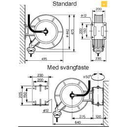 Högtrycksvatten, 400 barSlangvindor försedda med ställbara utmatningsarmar. Lätta att placera, även i trånga utrymmen. Kan även takmonteras. Kan kompletteras med svängbart väggfäste om slangen skall dras ut eller matas in i sidled. Slitaget på vindan blir mindre och slangen rullas upp jämnare. Vattentemperatur max 150 °C. Stålarmerad gummislang.