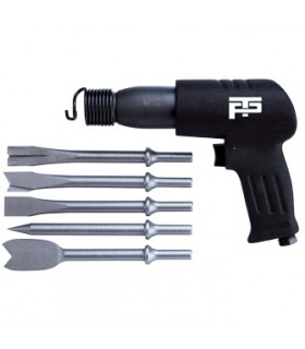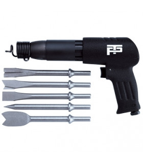 Mejselhammarkit Levereras i kraftig transportbox. Innehåller: * Mejselhammare. * 6 st mejslar: kantmejsel, ljuddämparmejsel, rak mejsel, skärmejsel, spett, punktsvetsmejsel. * Nippel 1/4”.