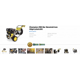 Välj Champion 290 Bar Bensindriven Högtryckstvätt för en rengöringsupplevelse i världsklass. Beställ din idag och upplev skillnaden som den oslagbara kraften och prestandan kan göra för dina rengöringsprojekt.