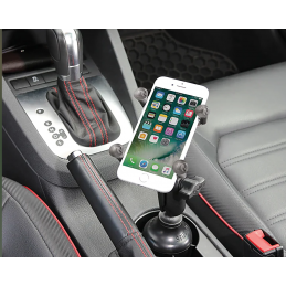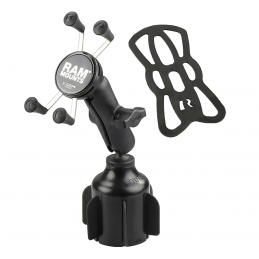 Består av en Stubby mugghållare som bas och som monteras i din burk-/flaskhållare i fordonet, med en medellång arm och universell fjäderbelastad X-Grip®-hållare för mobiltelefoner.