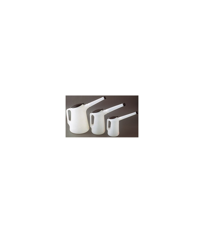 Oljemått, plast 2 liter Tillverkad av kraftig olje- och kemikaliebeständig plast. Behållaren är transparent, vilket gör det enkelt att se oljemängden. Böjlig pip, utrustad med lock för att förhindra smuts.