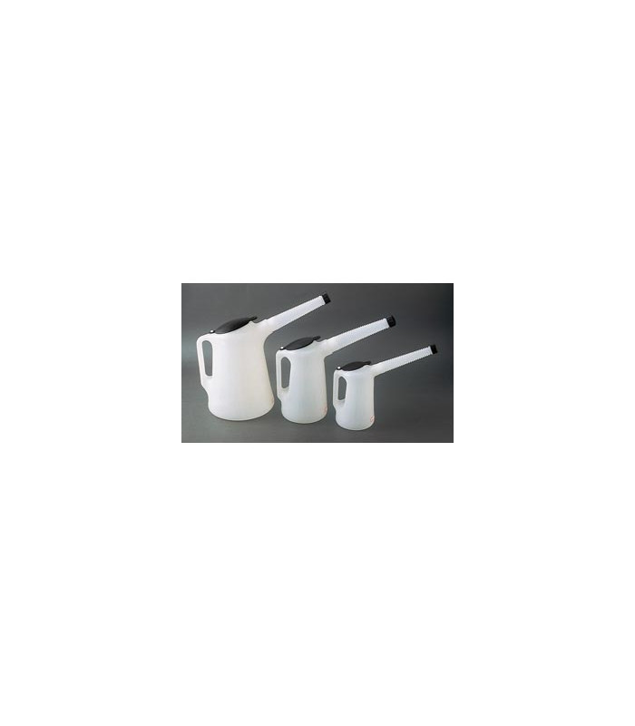 Oljemått, plast 2 liter Tillverkad av kraftig olje- och kemikaliebeständig plast. Behållaren är transparent, vilket gör det enkelt att se oljemängden. Böjlig pip, utrustad med lock för att förhindra smuts.