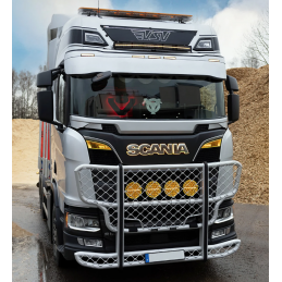 Stenskottsskyddet följer lastbilens formspråk och smälter perfekt in i alla karosspaneler för att få lastbilens front att verka ännu större.