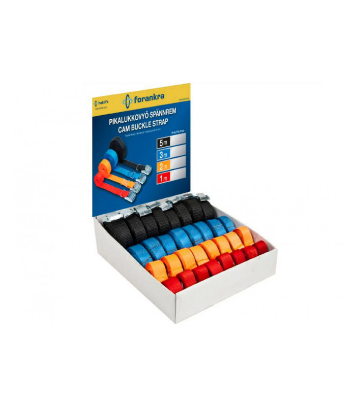 Sortimentslåda med 32 st delar. Kamlåssurrning är en allsidig spännrem med ett rejält kamlås gjutet i zink. Bandbredd: 25 mm, brottstyrka vid rakt drag: 250 kg.