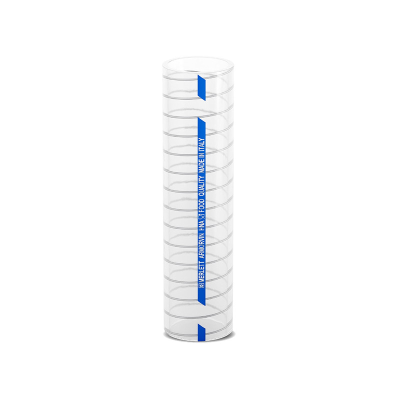 Lätt och flexibel slang för sug och tryck av vatten, juice, öl, vin, alkoholhaltiga drycker (upp till 15%) och torkade livsmedel. Värden för arbetstryck och vakuum gäller vid 20° C. Godkänd för användning tillsammans med livsmedel. Före transport av livsmedel tvättas slangen med 5% sodalösning. Innertub: PVC, livsmedelskvalitét Metervara