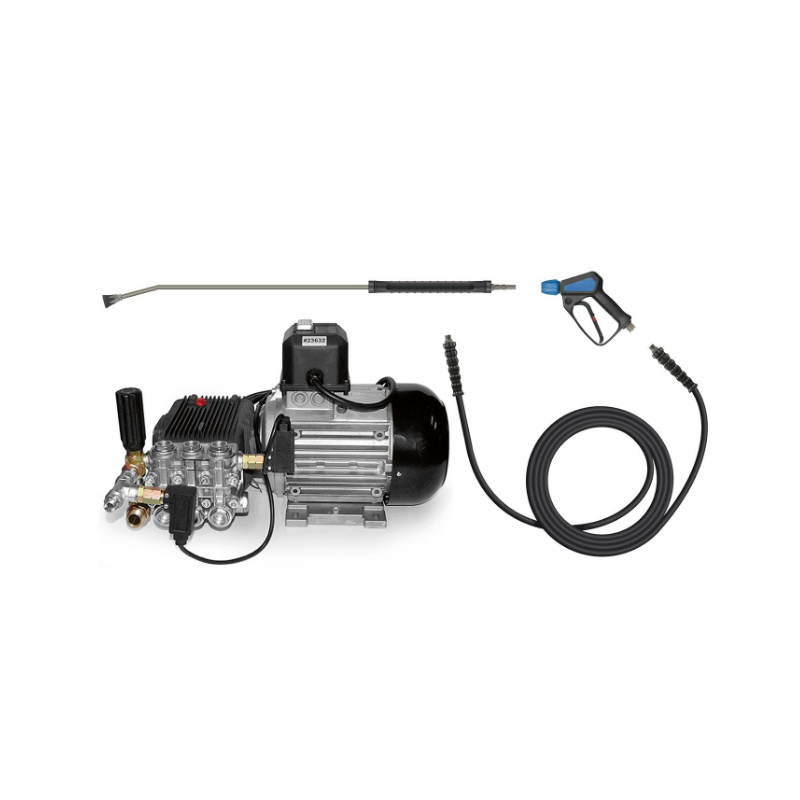 Komplett pump/motor med start & stopp automatik, elbox och brytare. In-line kolvpump för kontinuerlig användning. Total-stopp-system med fördröjd totalstopp. Säkerhetsavstängning efter 20 min.