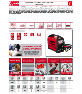 Telwin Technology Tig 230 DC/HF/LIFT är en 1-fas microprocesstyrd invertersvets med likström, tomgångsspänning på 95V och elanslutning på 230V.