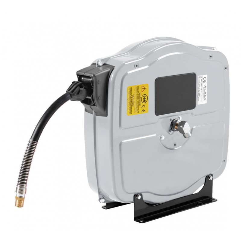 Luft/vattenvinda med automatisk fjäderretur. Plasthölje. Väggfäste i stål. Utrustad med flyttbar slangstopp.