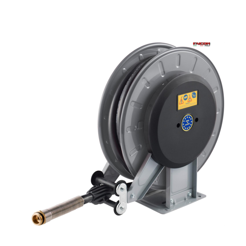 Luft/vattenvinda med automatisk fjäderretur. Plasthölje. Väggfäste i stål. Utrustad med flyttbar slangstopp.