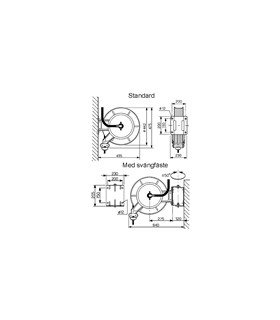 Luft - Vatten, 18 bar Slangvinda försedd med ställbara utmatningsarmar. Lätt att placera, även i trånga utrymmen. Kan även takmonteras. Vindan är pulverlackerad och utrustad med returfjäder. Kan kompletteras med svängbart väggfäste om slangen skall dras ut eller matas in i sidled. Slitaget på vindan blir mindre och slangen rullas upp jämnare....