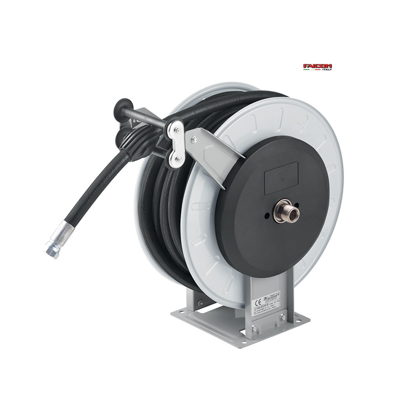 Slangupprullare med livsmedelsklassad slang från Italienska Faicom Max tryck: 10bar vid 70°C, 20bar vid 25°C Automatisk slangupprullare avsedd för tvättoperationer med vatten och diskmedel vid olika tryck- och temperaturförhållanden.