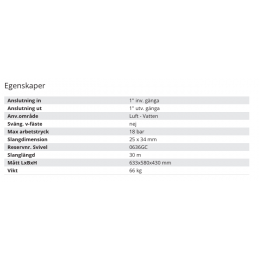 Anslutning in: 3/8 inv. gänga Anslutning ut: 3/8 utv. gänga Anv.område: Luft Max tryck: 15 bar Slangdimension: 10 mm Slanglängd: 12 m Mått LxBxH: 370x290x220 mm Vikt: 3,6 kg