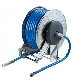 Luft/vattenvinda med automatisk fjäderretur. Plasthölje. Väggfäste i stål. Utrustad med flyttbar slangstopp.